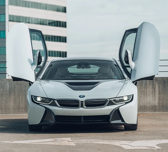The BMW i8 stands at the forefront of automotive innovation, blending futuristic design with sustainable performance in a way that redefines the sports car category. Its aerodynamic silhouette and scissor doors make a striking statement, embodying BMW’s commitment to cutting-edge design. The iconic BMW badge on its sleek hood symbolizes its legacy of engineering excellence.